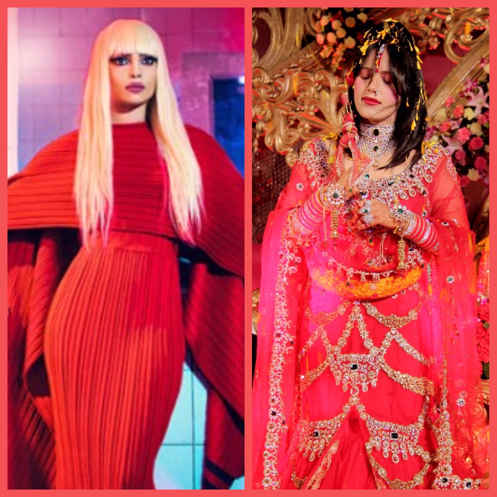 In the pic, the actress has donned a stunning “red knit dress with a cape-styled detail on the neckline, with bold graphic liner on the eyes and a red lipstick. But what is most striking about her look is the blonde wig”, reads the write-up adding tweets like “Guys, the wait is over. Radhe Maa is back.”